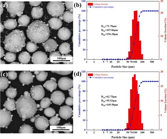 图1. (a,b)CuSn10和(c,d)IN718粉末的形态和粒度分布。