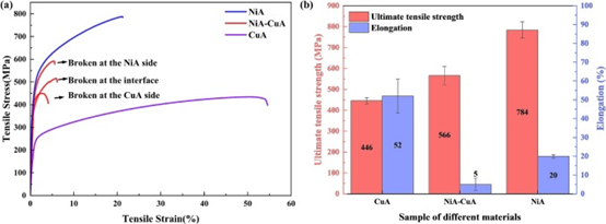 NiA-CuA双金属结构的拉伸强度为566 MPa,介于IN718和CuSn10的拉伸强度之间。但由于界面存在微裂纹,其伸长率有所下降。CuA-NiA双金属结构由于存在严重裂纹,无法进行拉伸测试。