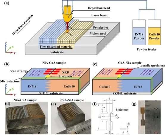 图2. (a)LDED过程的原理图;(b-c)双金属结构示意图;(d-e)制备的NiA-CuA和CuA-NiA样品;(f)拉伸试样的尺寸;(g)典型拉伸试样。