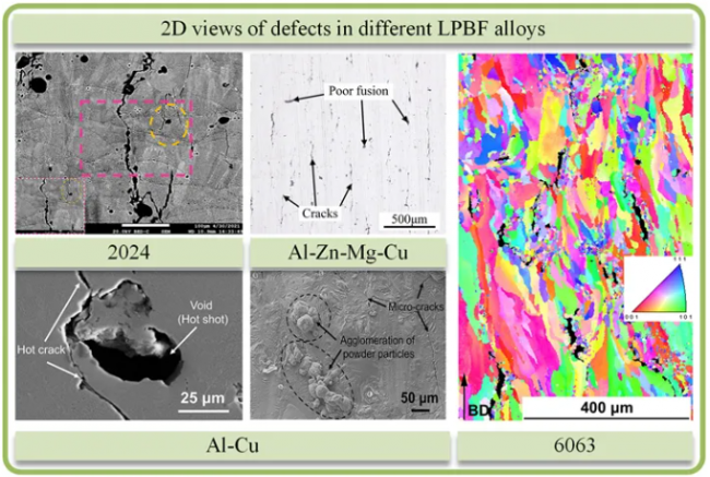 针对增材制造铝合金中气孔、裂纹、球化等缺陷的研究领域已经得到了极大的扩展。增强的分析技术加深了对这些缺陷的理解,并促进了对这些缺陷的详细检查,如图8中各种合金的显微结构图像所示。气孔等缺陷,以及未充分熔化的颗粒和残余粉末,通常作为内部微裂纹的成核点,从而降低了合金的机械性能。计算机断层扫描(CT)技术的出现彻底改变了我们在三维上可视化这些缺陷的能力,展示了它们复杂的结构和形态。这一技术进步为这些缺陷的发生和发展以及它们在合金中的微观力学行为提供了更彻底和细致入微的视角。